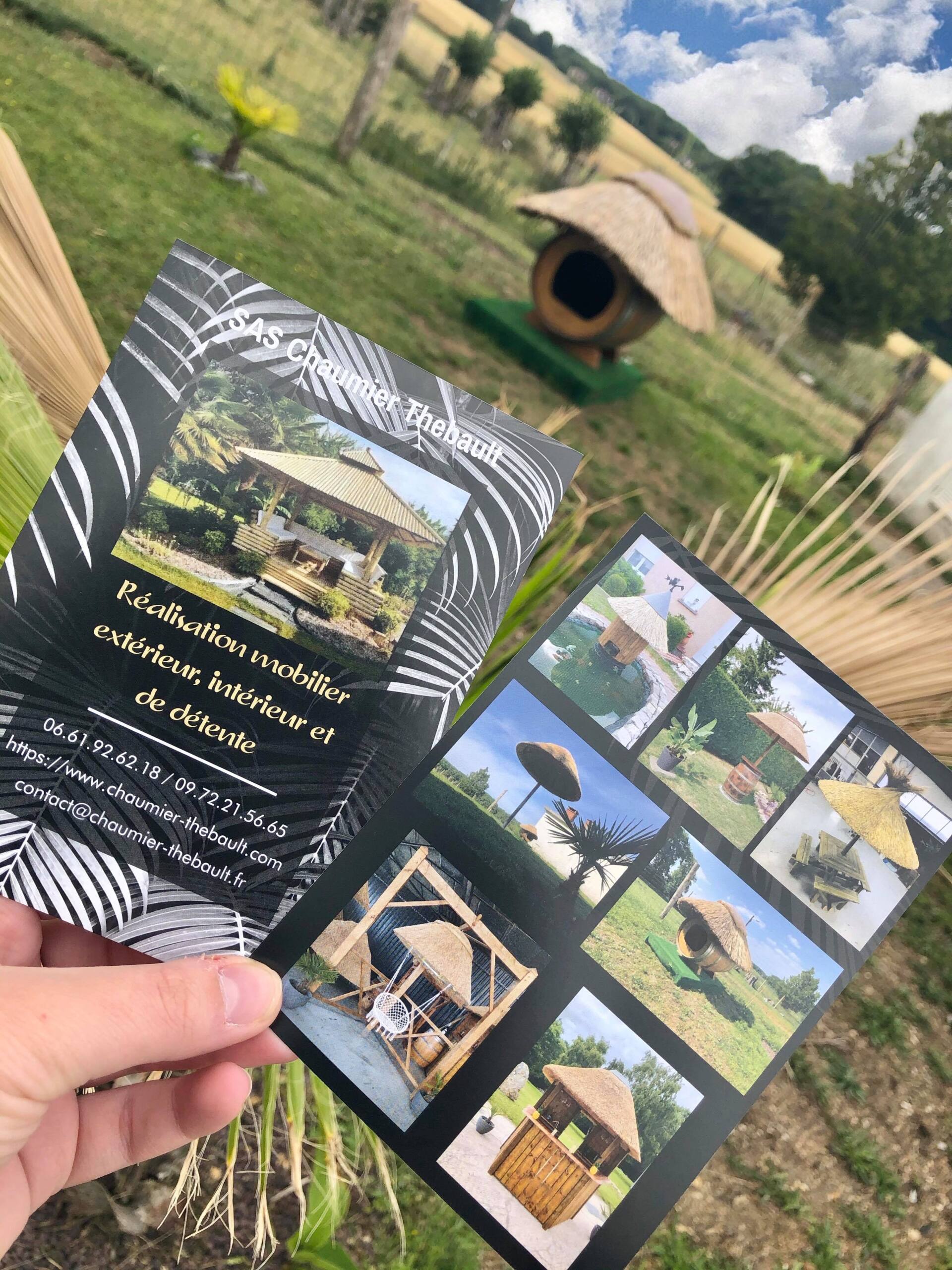 Réalisation de 3 tables paillotes de pique-nique et d'une paillote tonneau ainsi que tout l'aménagement extérieur (taillage d'arbre, de buisson, etc.) au restaurant "Le chalet" à Chartres (28).