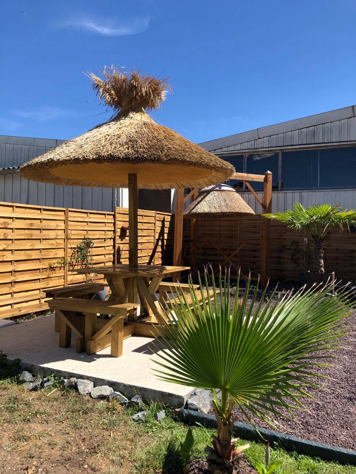 Installez-vous jusqu'à huit personnes et profitez du soleil, tout en étant protégé par le toit de chaume.